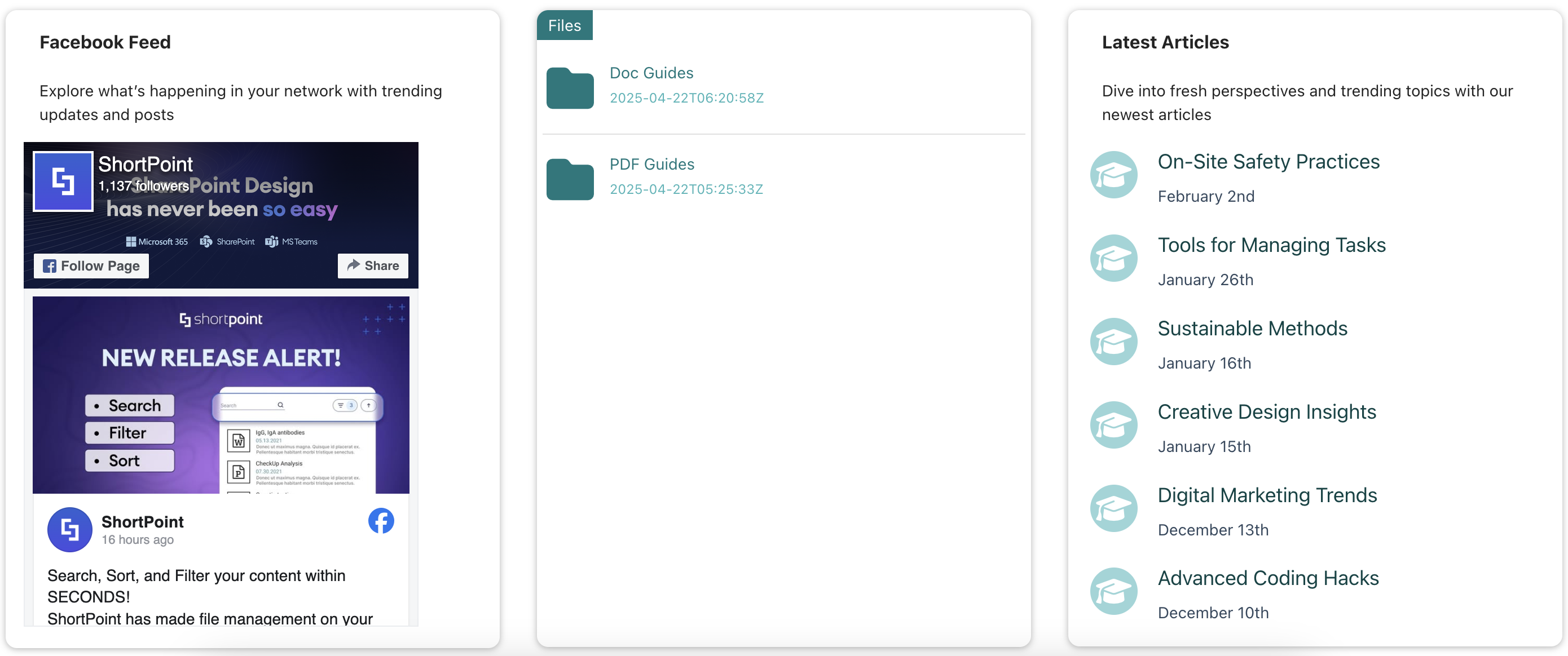 NOTEIf you want to showcase both folders and files, check out the following articles: >How to Show a Mixed View of Files and Folders from a Document Library Using REST API >How to Show Both Files and Folders of the Document Library in a ShortPoint Element >How to Show Top-Level Folders and Files from a Document Library Using REST API