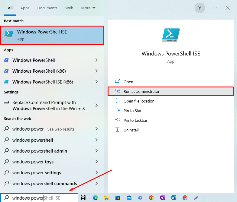 Search for the Windows PowerShell ISE application and choose Run as administrator.