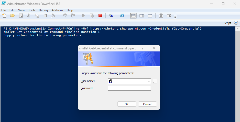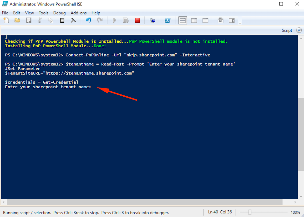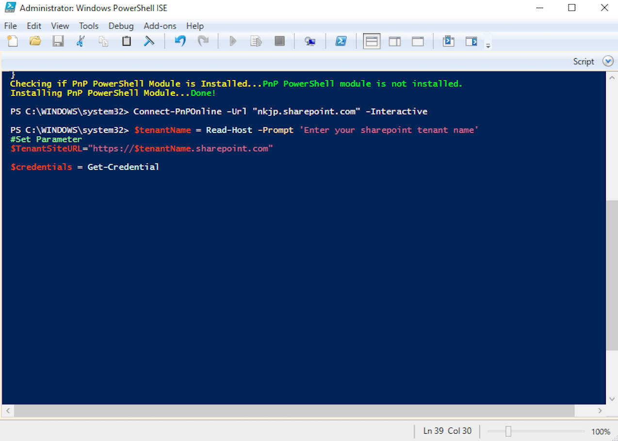 $tenantName = Read-Host -Prompt 'Enter your sharepoint tenant name' #Set Parameter $TenantSiteURL="https://$tenantName.sharepoint.com" $credentials = Get-Credential