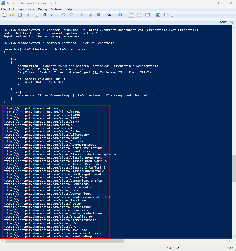 Let the command run and list SharePoint site URLs, and that's it! You now have a list of all site collections that have ShortPoint.