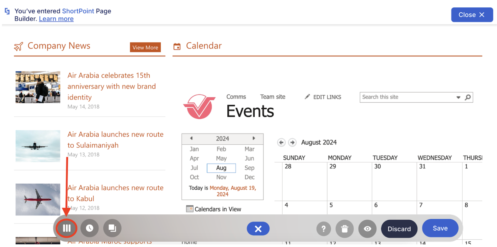 The SharePoint Web Part Design Element allows you to embed SharePoint web parts into ShortPoint Design Elements, but it can also be used to add a calendar to your page. This article will demonstrate how you can do that.
