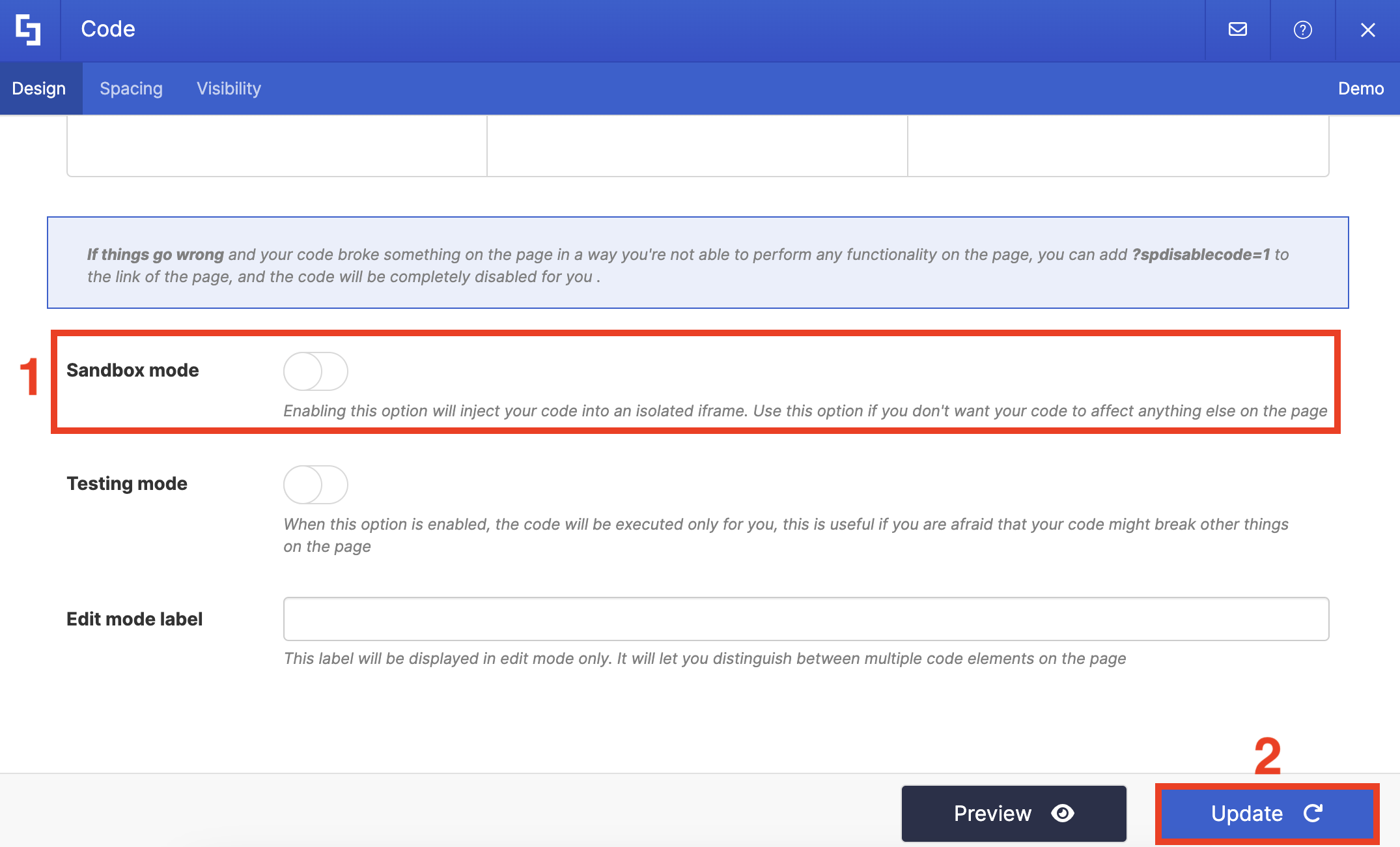 Make sure [1] Sandbox Mode is disabled and click [2] Update:
