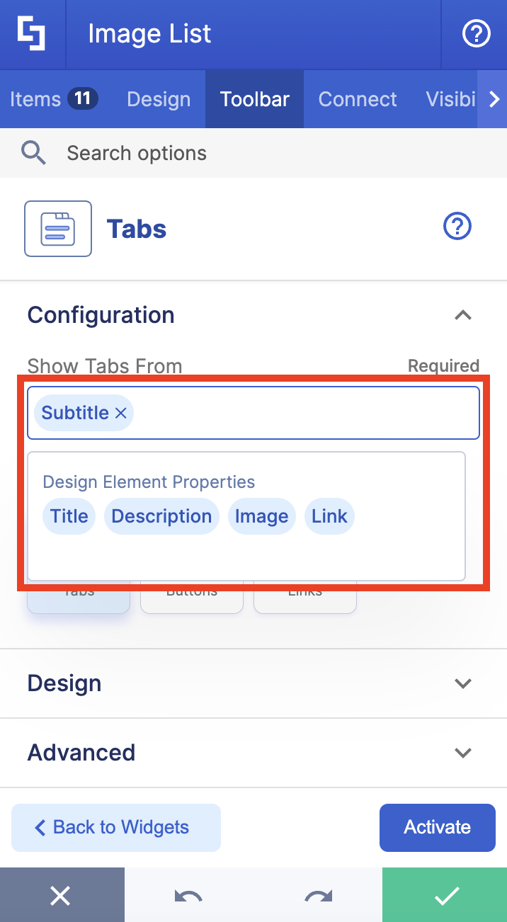 - Choose the Design Element property (Title, Subtitle, Description, etc.) you want to be shown as Tabs.
