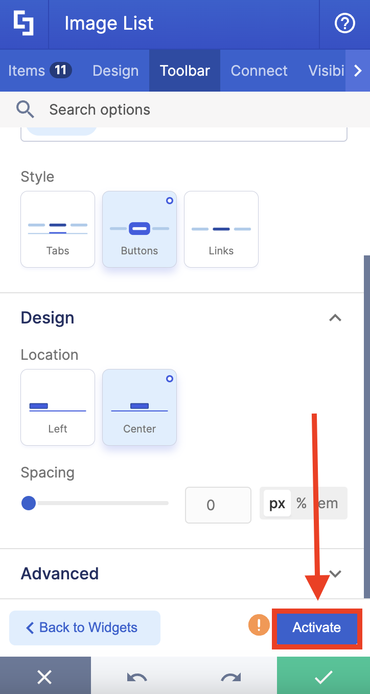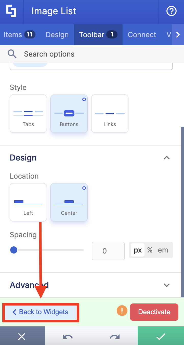 NOTEIf you want to remove the Tabs widget, simply click the Tabs widget again, select Deactivate, and click the green check mark to apply the changes. You can also check out How to Deactive Active Search & Filter Toolbar Widgets for more details.