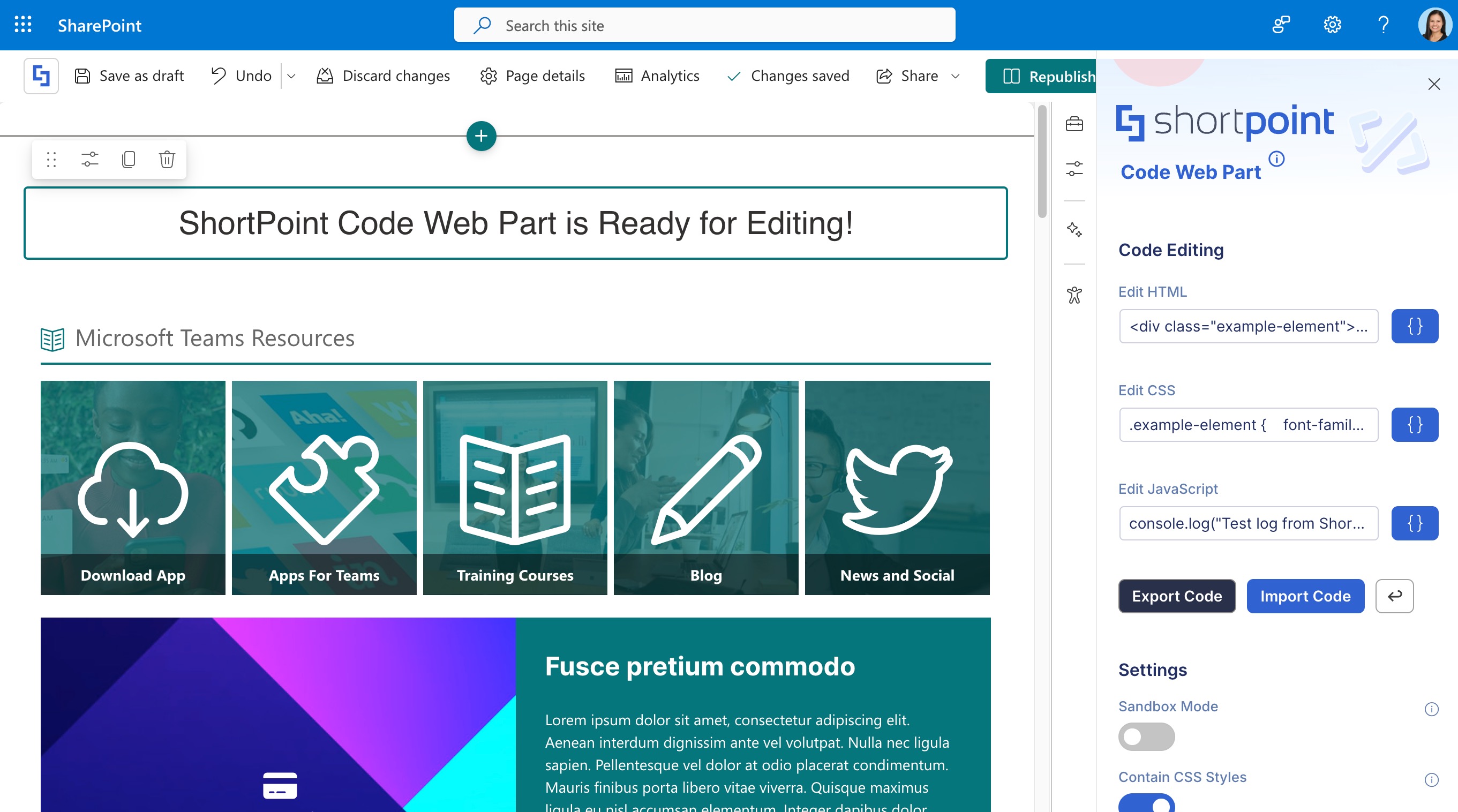 Let's explore the essential features and capabilities of the ShortPoint Code Editor Web Part to help you get started: