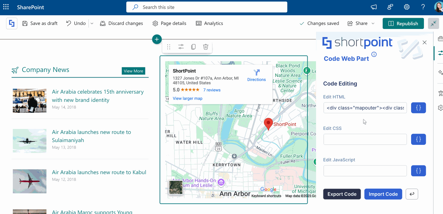 This article will demonstrate how to embed Google Maps into your SharePoint page using the FREE ShortPoint Code Editor. Follow the quick walkthrough or see the detailed steps in Step-by-Step Tutorial to start your journey.