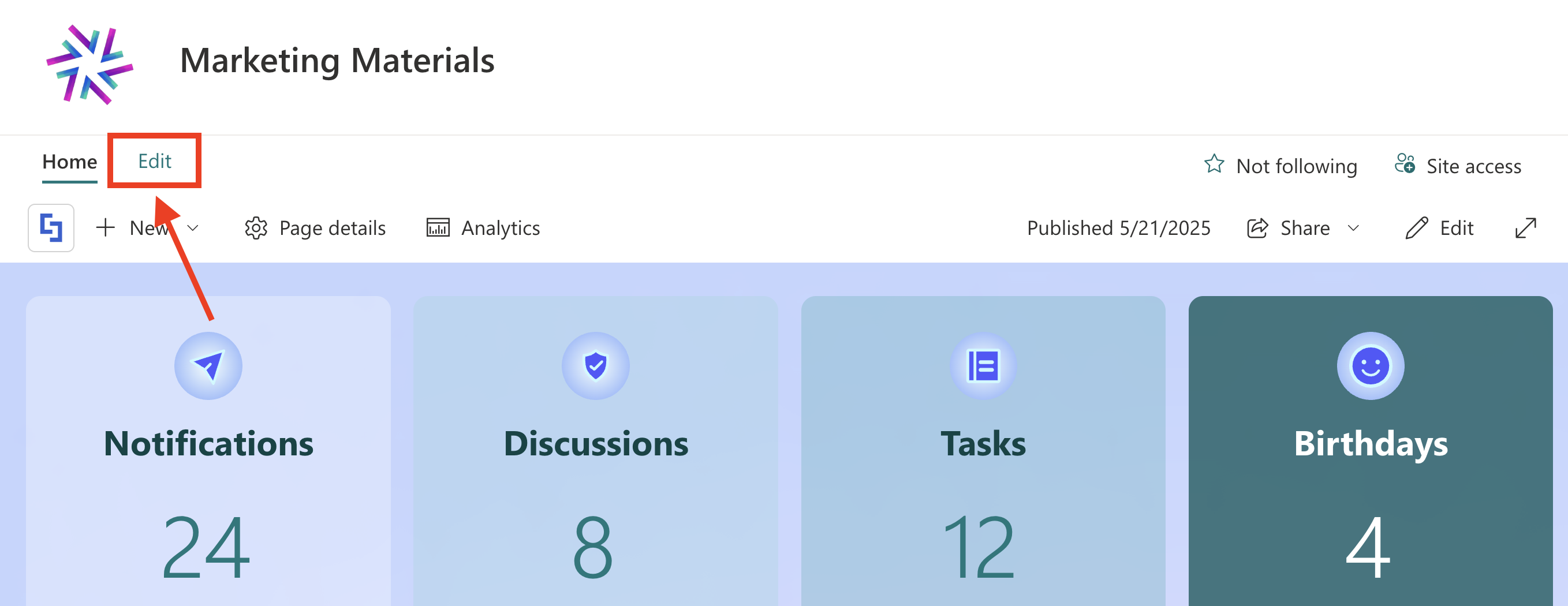 Go to the SharePoint page you want to use and click Edit: