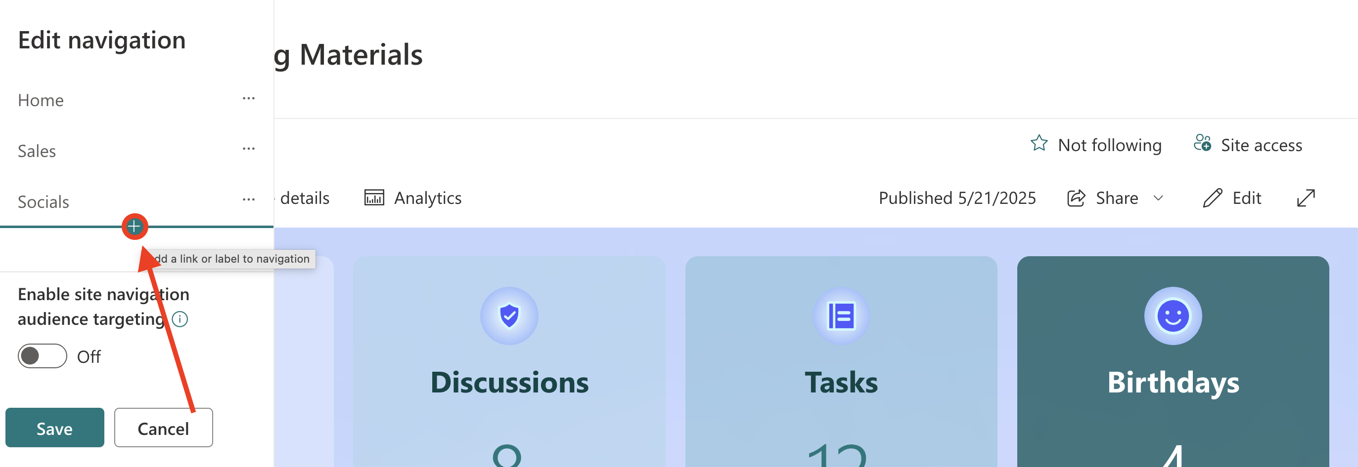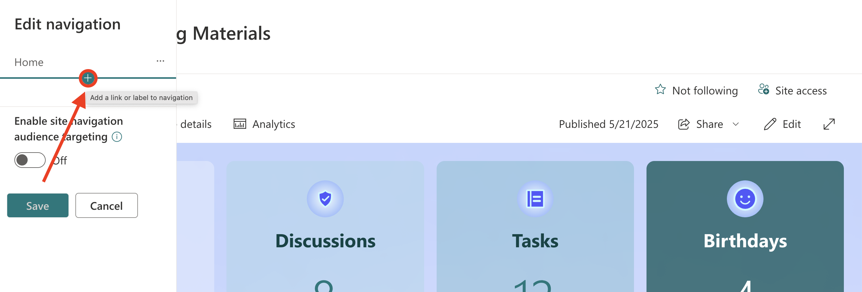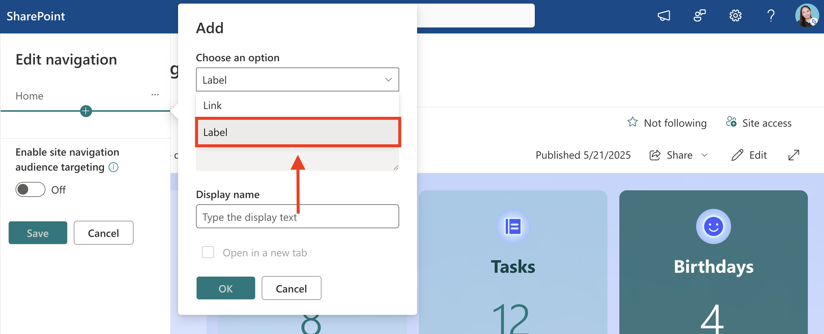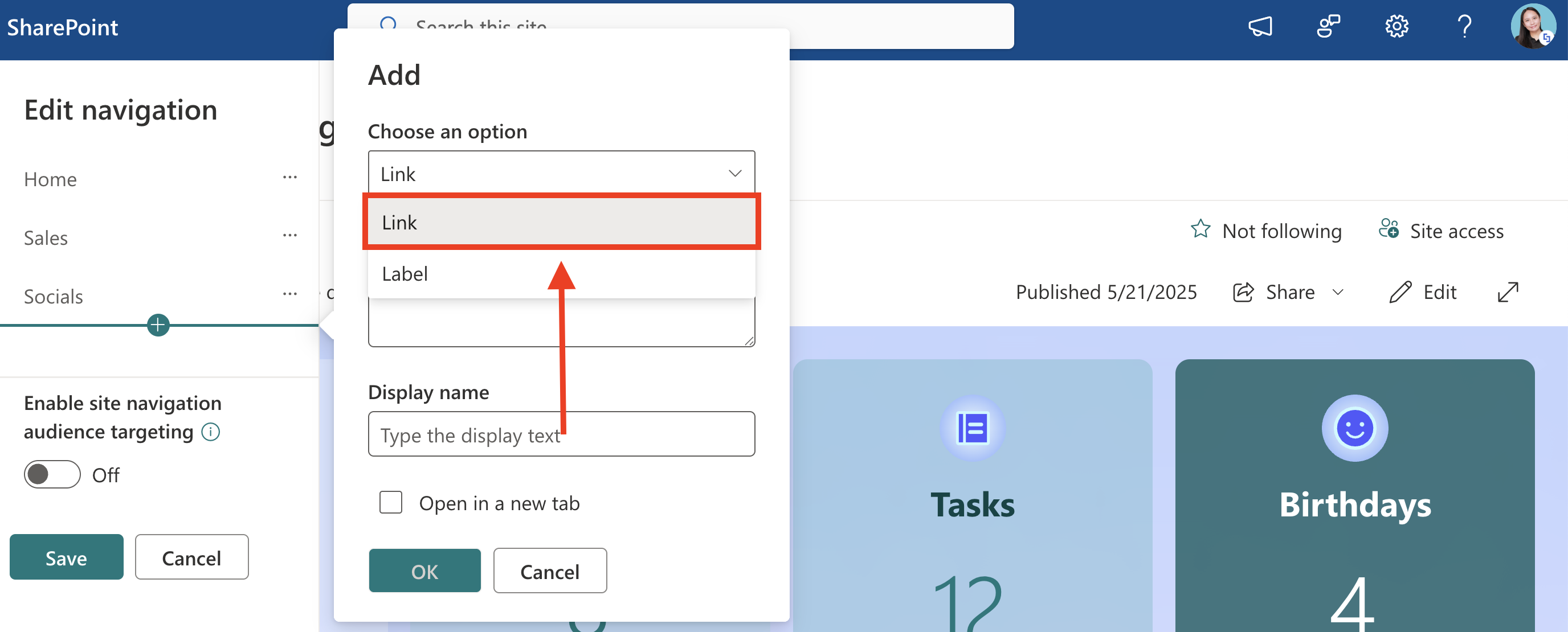NOTEIf you wish to turn on audience targeting to promote content for specific audiences, toggle on Enable site navigation audience targeting. This will add the Audiences to Target field, which allows you to specify who can see the links and labels you create.