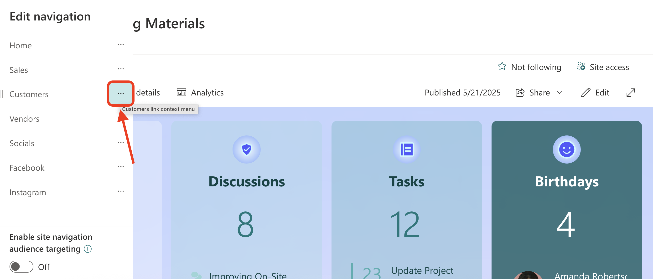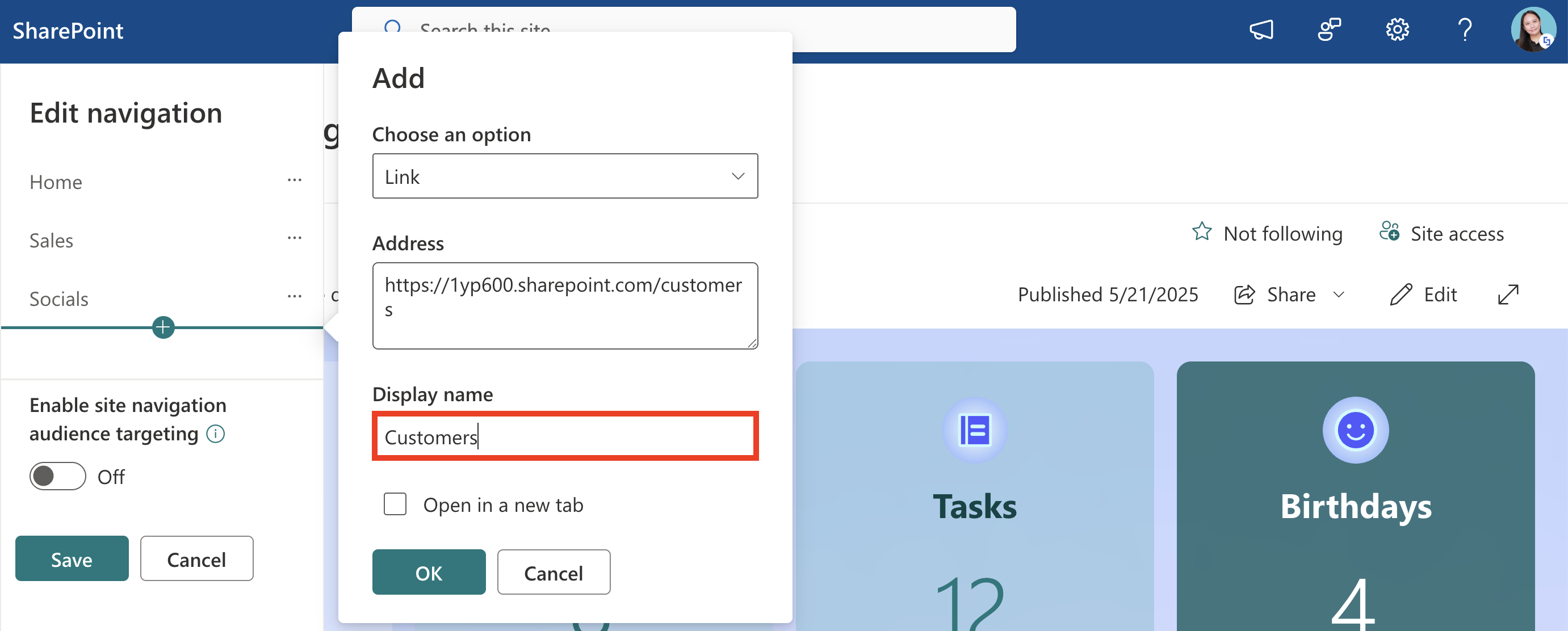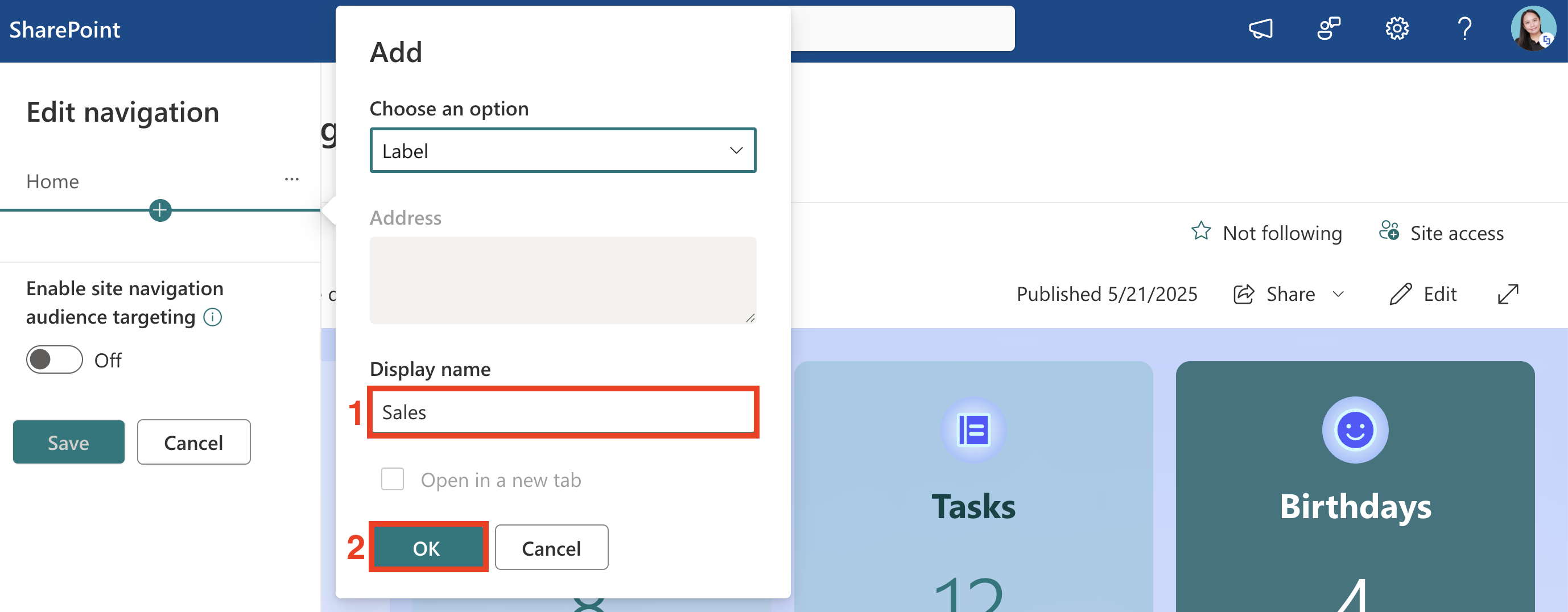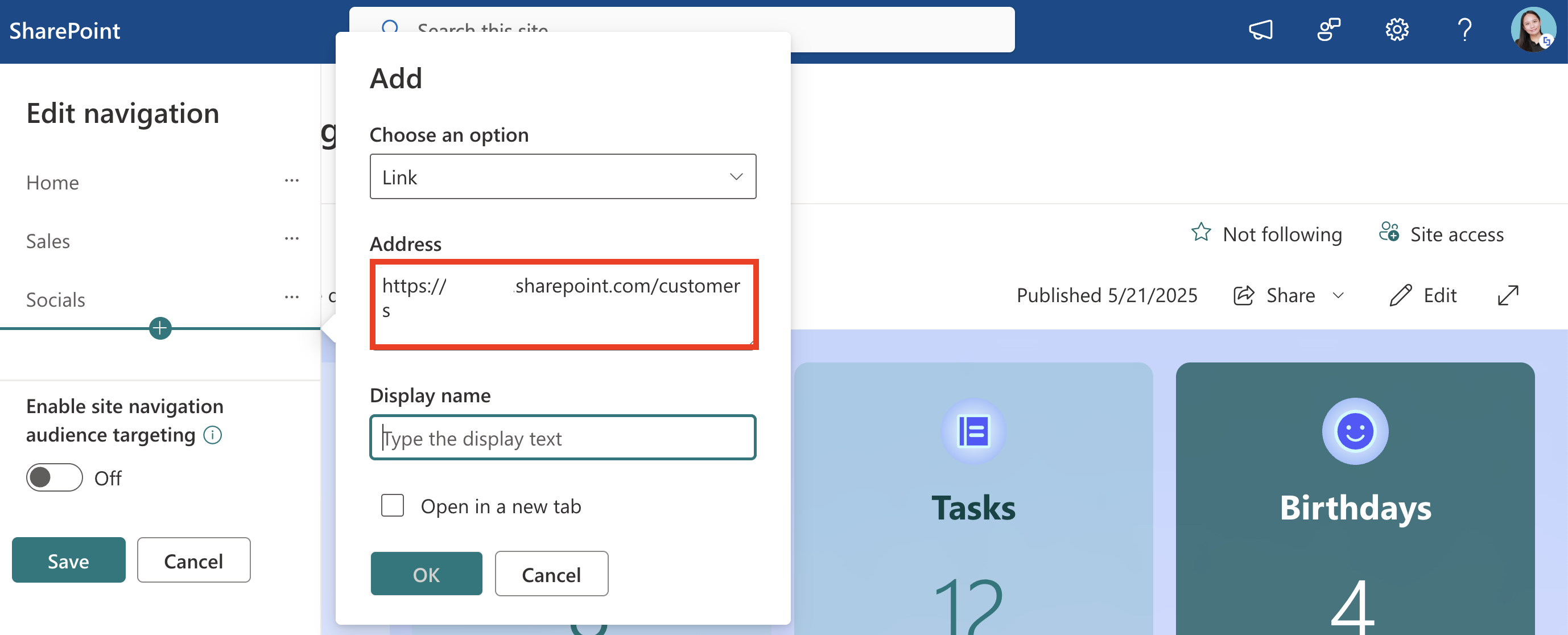NOTEIf you wish to turn on audience targeting to promote content for specific audiences, toggle on Enable site navigation audience targeting. This will add the Audiences to Target field, which allows you to specify who can see the links and labels you create.