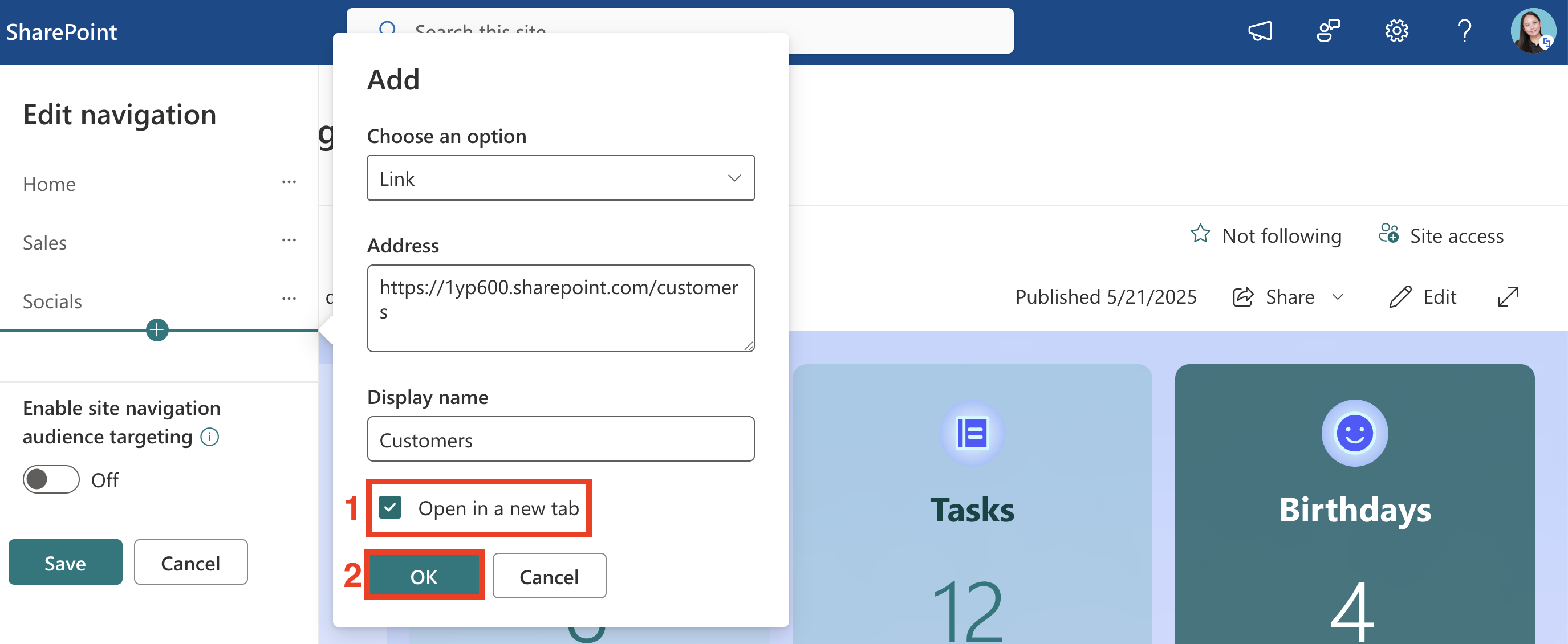 Toggle on [1] Open in a new tab if you want the link to open in a new tab, and click [2] OK: