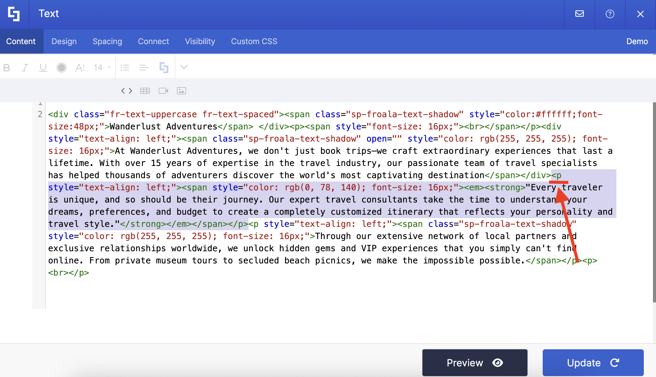 NOTEBefore proceeding, make sure you already have a Text Design Element with paragraphs inside. In our example below, we want to be redirected to the highlighted paragraph: