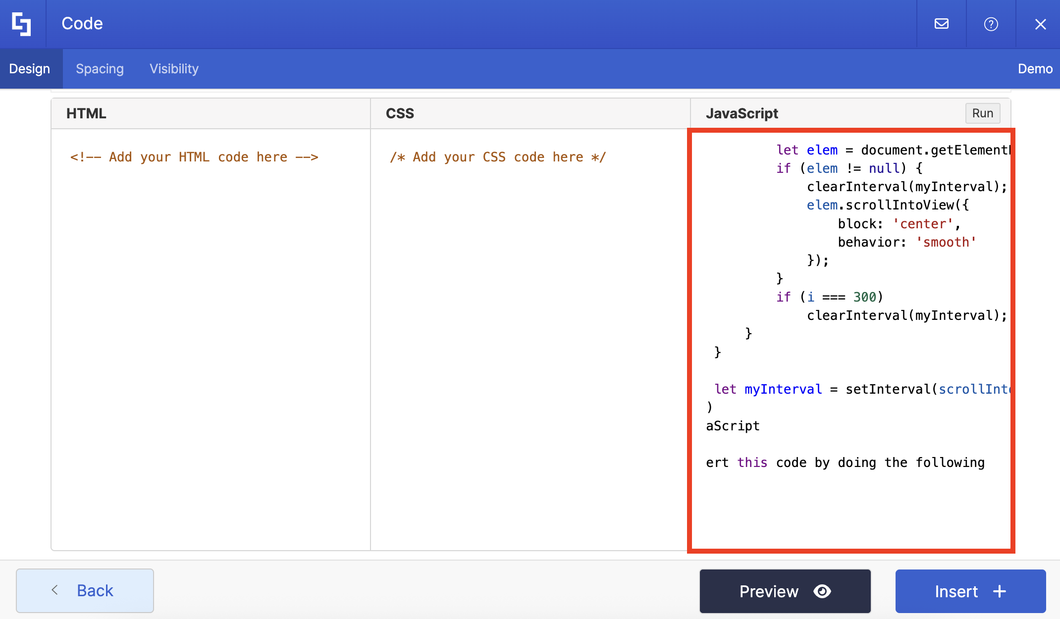 Paste the code in the JavaScript field: