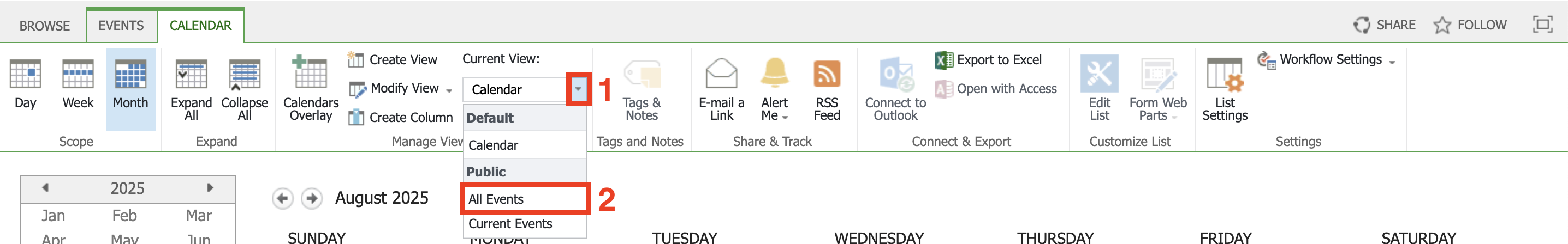 - Under the [1] Current View drop-down, choose [2] All Events: