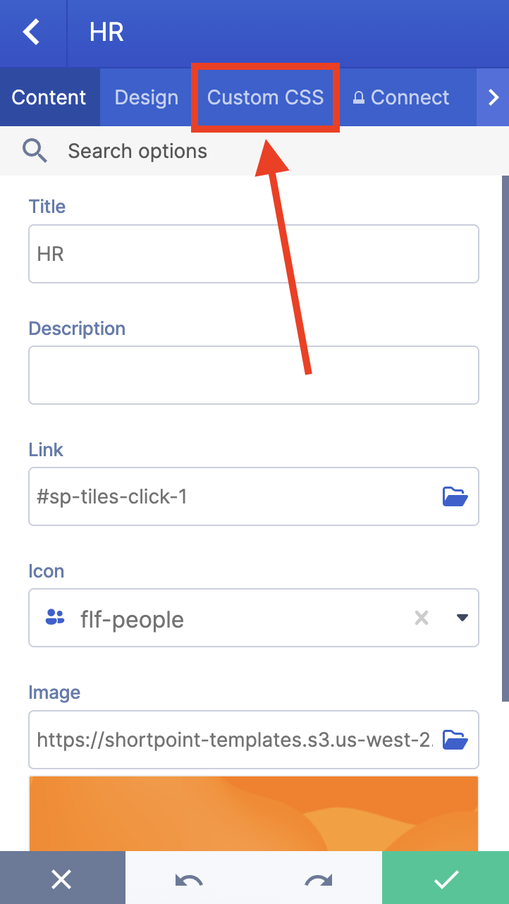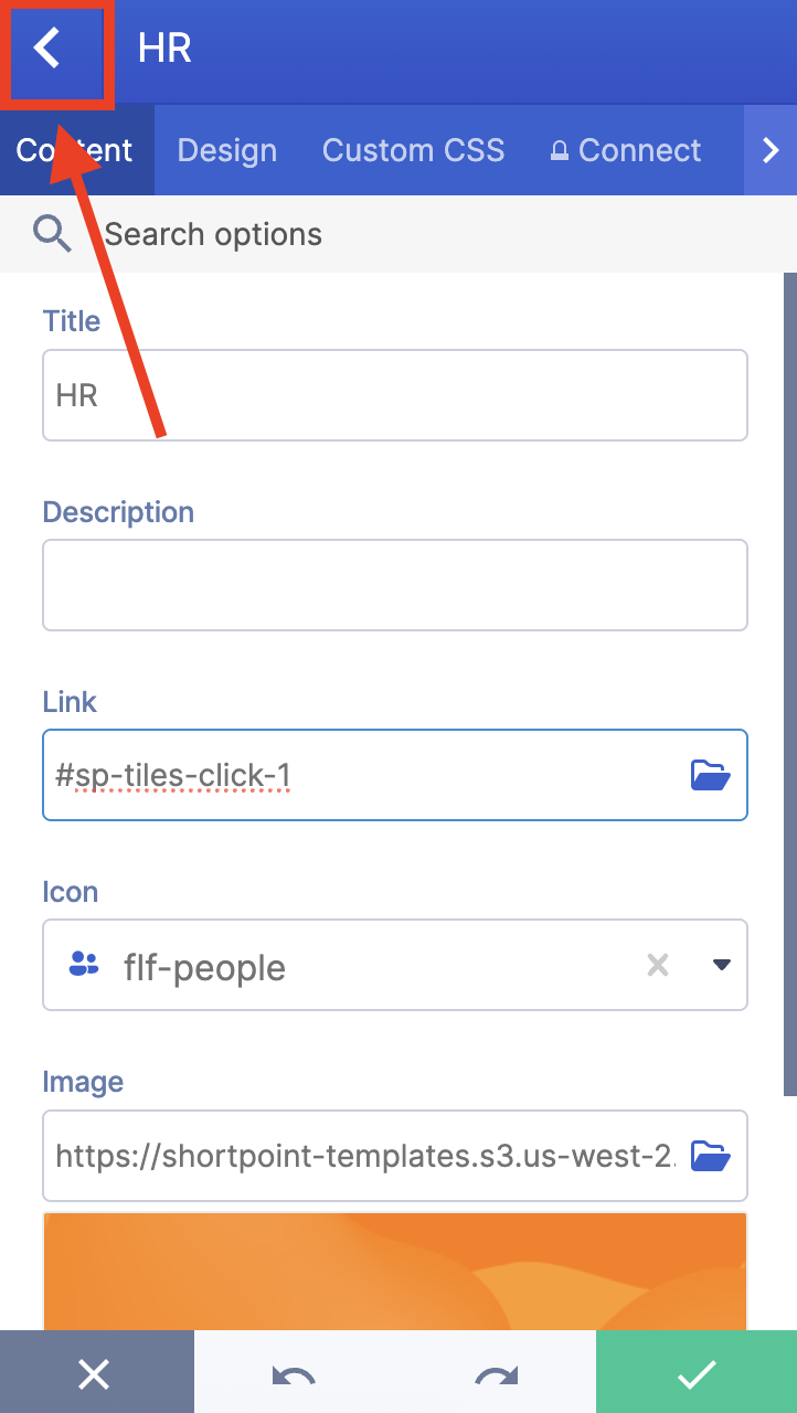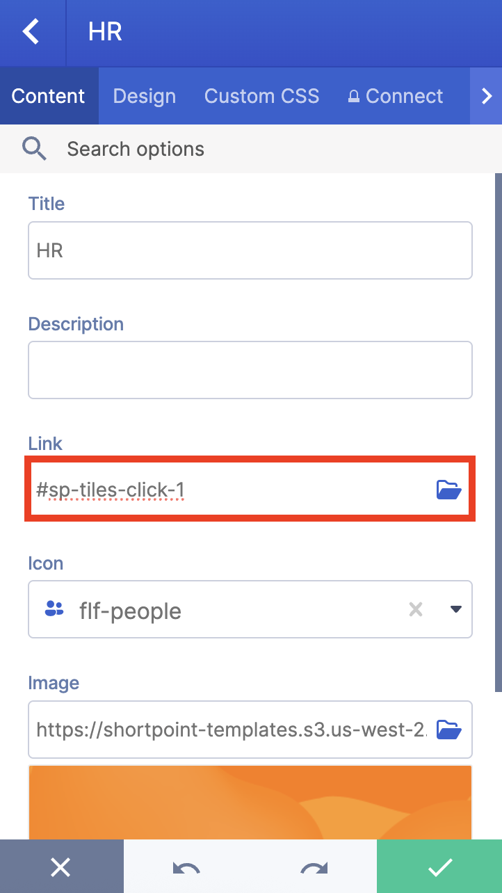 In the Link field, enter '#sp-tiles-click-number'. The number in this link must match the number you used in the Class Name from Step 3. For example, if your Class Name for this specific item is 'sp-tiles-click-1', then your Link should be '#sp-tiles-click-1'.