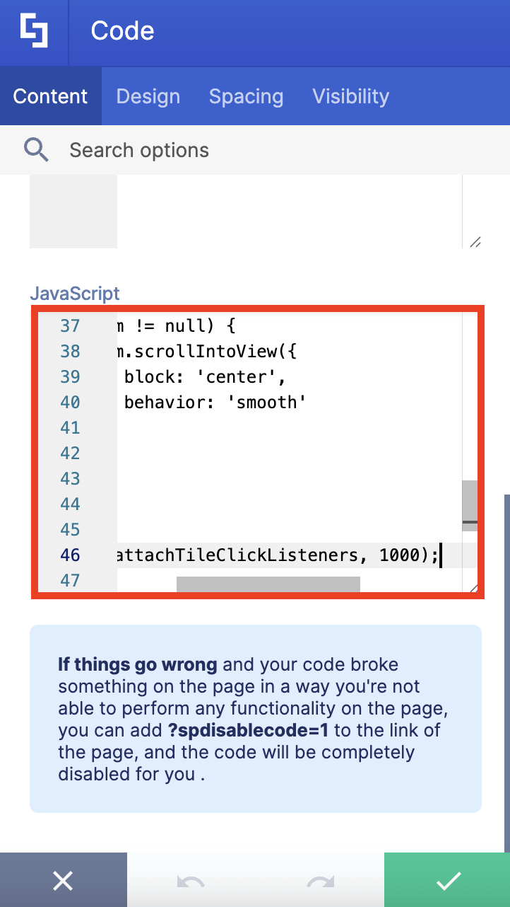 setTimeout(attachTileClickListeners, 1000);Step 8: Insert a Code Design Element