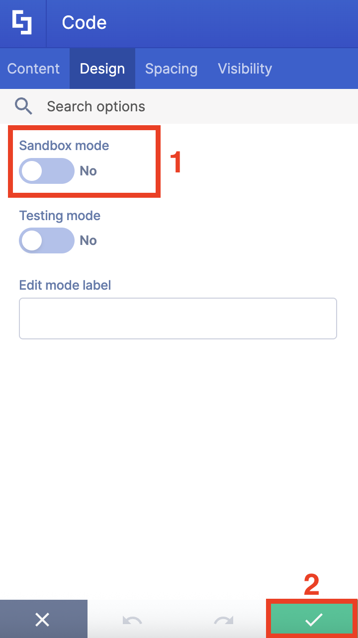 [1] Disable Sandbox Mode and click the [2] green check mark: