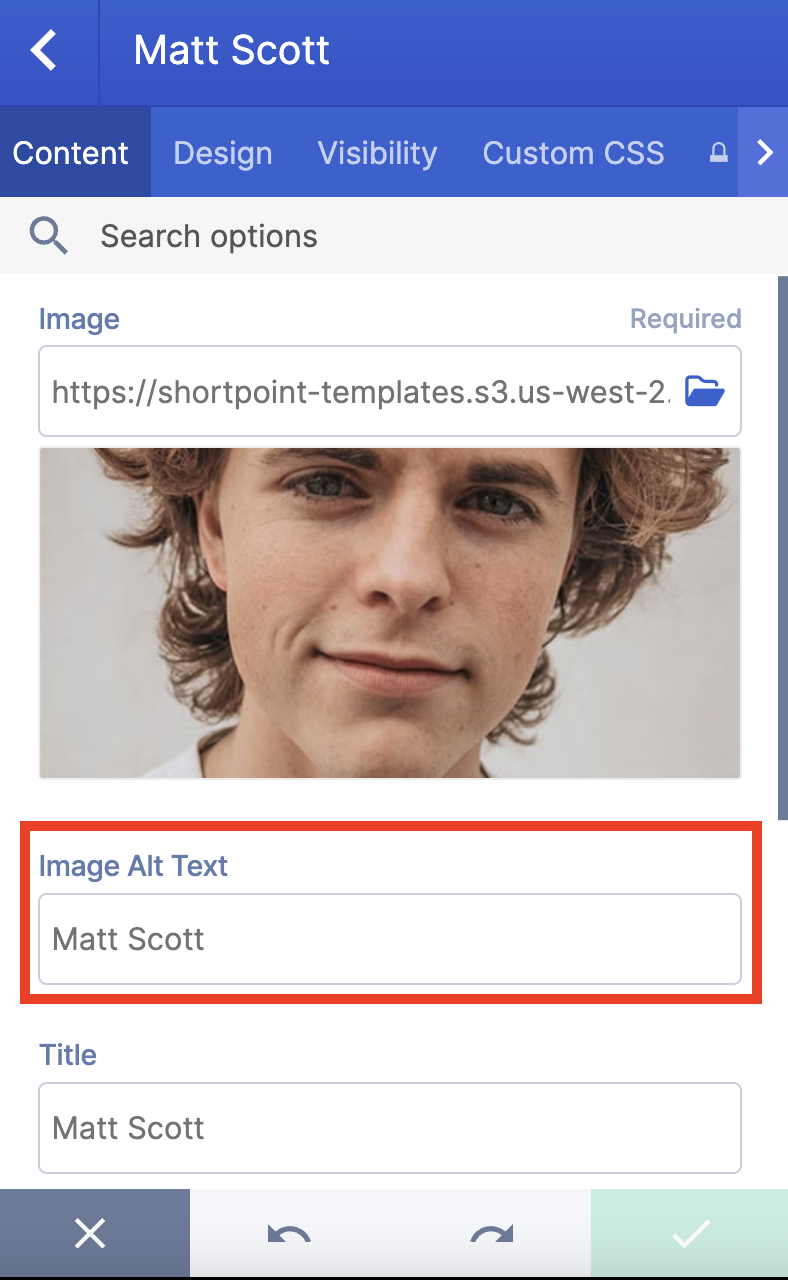 Depending on the Design Element you’re using, the location of the Image Alt Text property will vary: